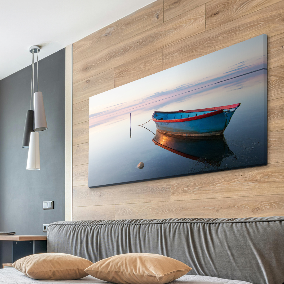 Akustikbild PURE mit „Abendstimmung, stiller See mit Boot“-Motiv für die Wand – das Wellness-Erlebnis für Ihre Augen und Ohren