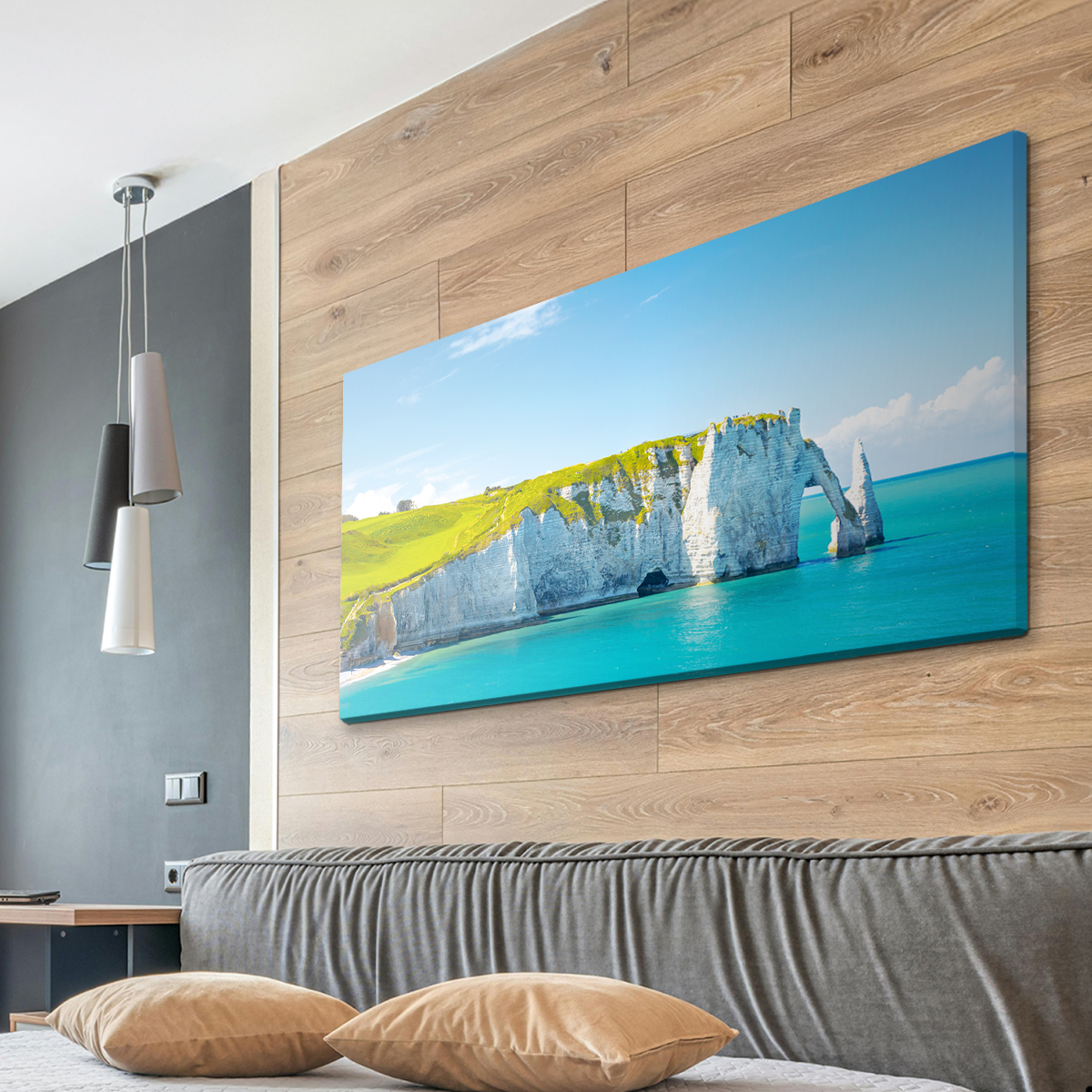 Akustikbild PURE mit „Étretat, Kreidefelsen, Frankreich“-Motiv für die Wand – das Wellness-Erlebnis für Ihre Augen und Ohren