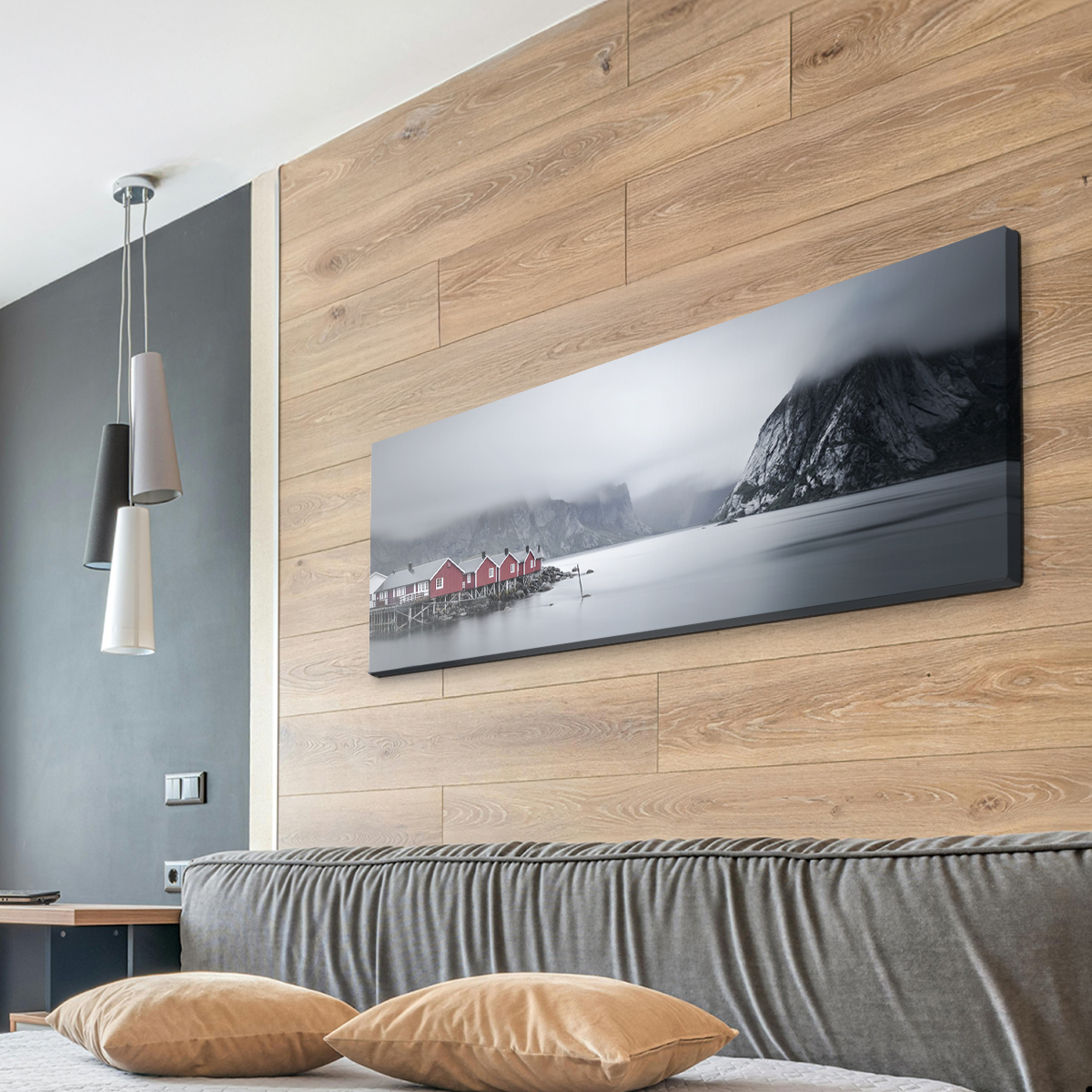 Akustikbild PURE mit „Fjord auf den Lofoten, Norwegen“-Motiv für die Wand – das Wellness-Erlebnis für Ihre Augen und Ohren