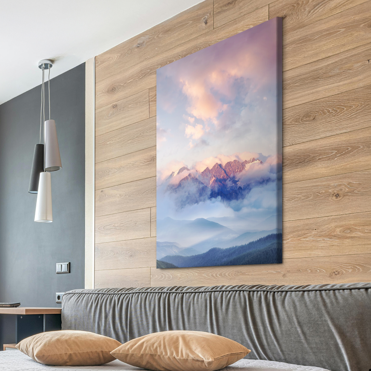 Akustikbild PURE mit „Hohe Berge im Abendlicht“-Motiv für die Wand – das Wellness-Erlebnis für Ihre Augen und Ohren