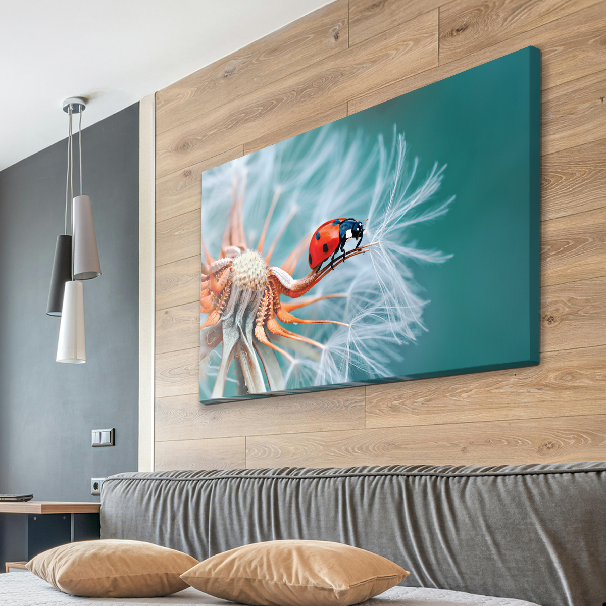 Akustikbild PURE mit „Marienkäfer auf einer Pusteblume“-Motiv für die Wand – das Wellness-Erlebnis für Ihre Augen und Ohren