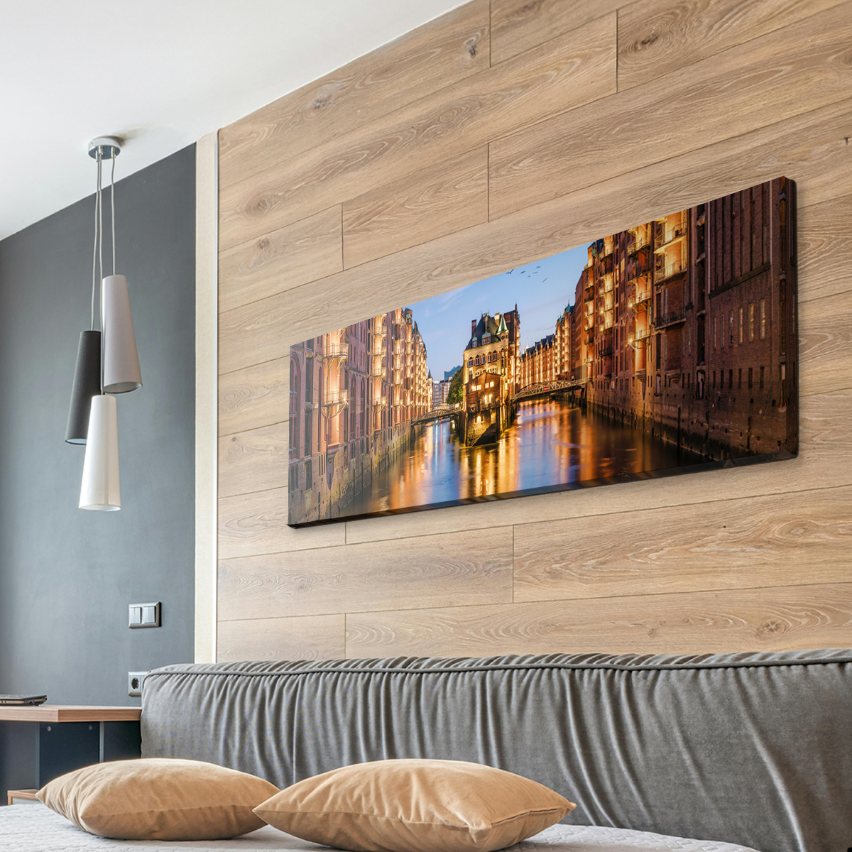 Akustikbild PURE mit „Wasserschlößchen in der Speicherstadt, Hamburg“-Motiv für die Wand – das Wellness-Erlebnis für Ihre Augen und Ohren