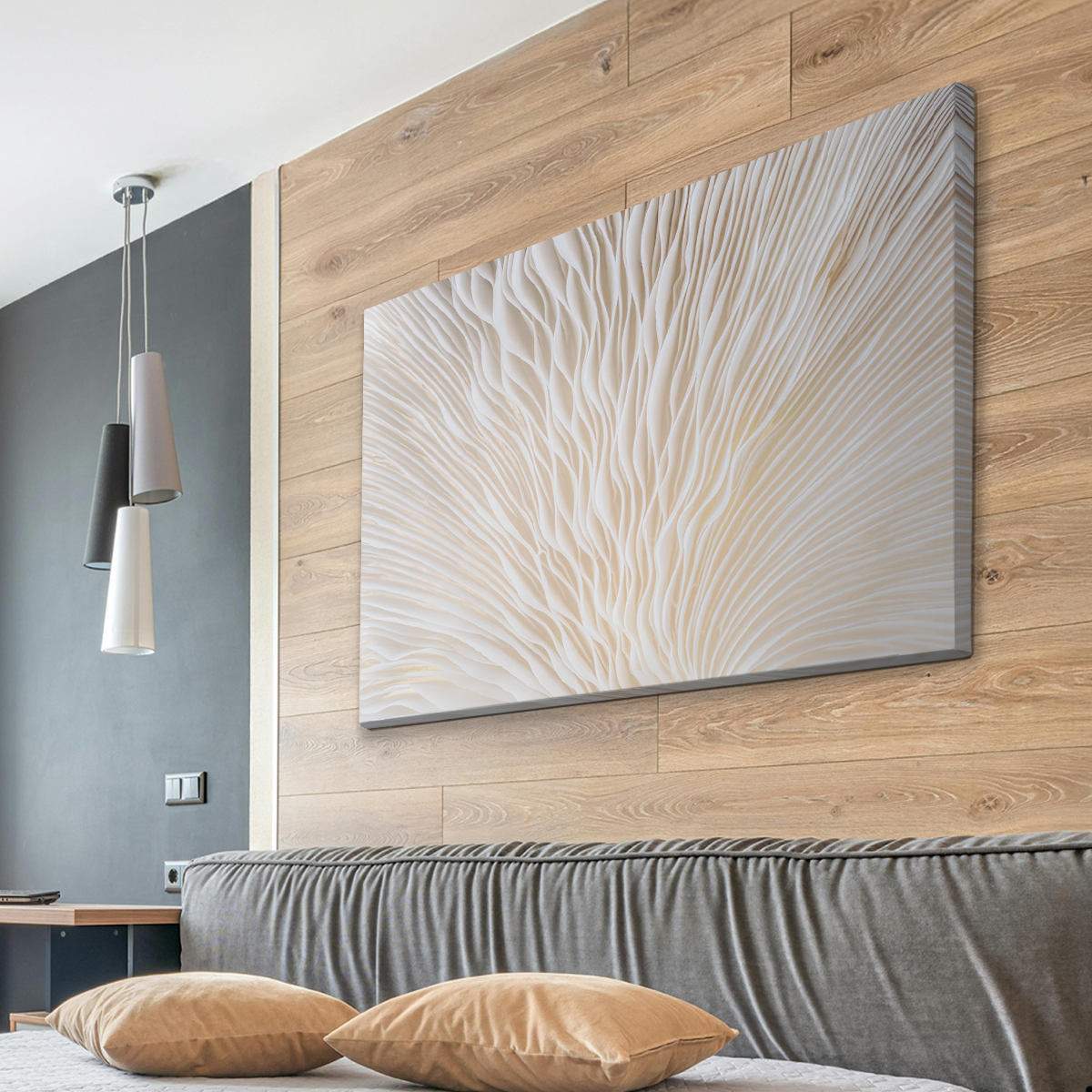 Akustikbild PURE mit „Weiße Pilz-Lamellen“-Motiv für die Wand – das Wellness-Erlebnis für Ihre Augen und Ohren